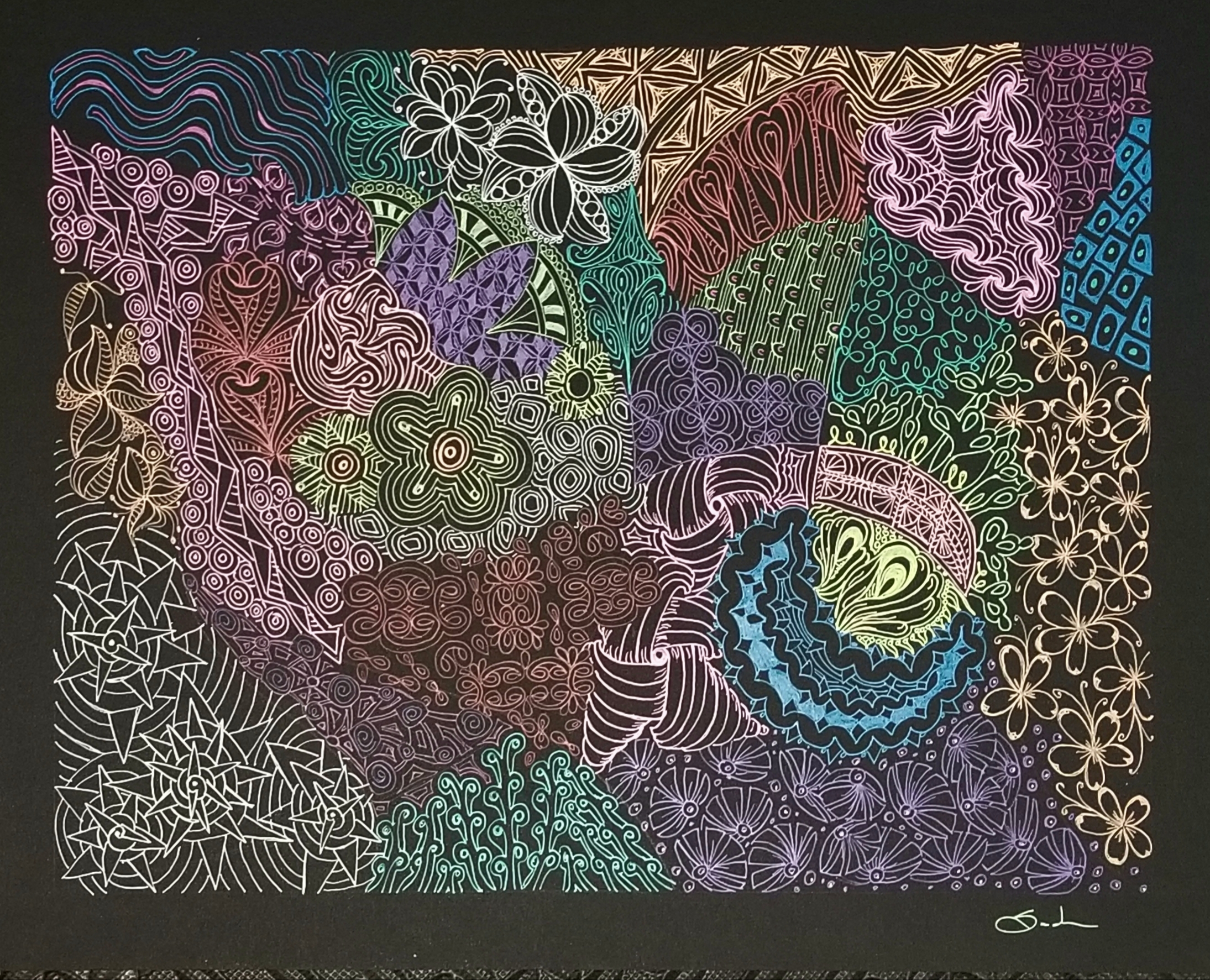 In 2009 a trend called Inktober was envisioned. I don’t participate in Inktober, but I do try draw a tangle a day during the month and I like drawing on 16″x20″ art board. Below is my tangle drawing using a black art board and Sakura Gel Pens.